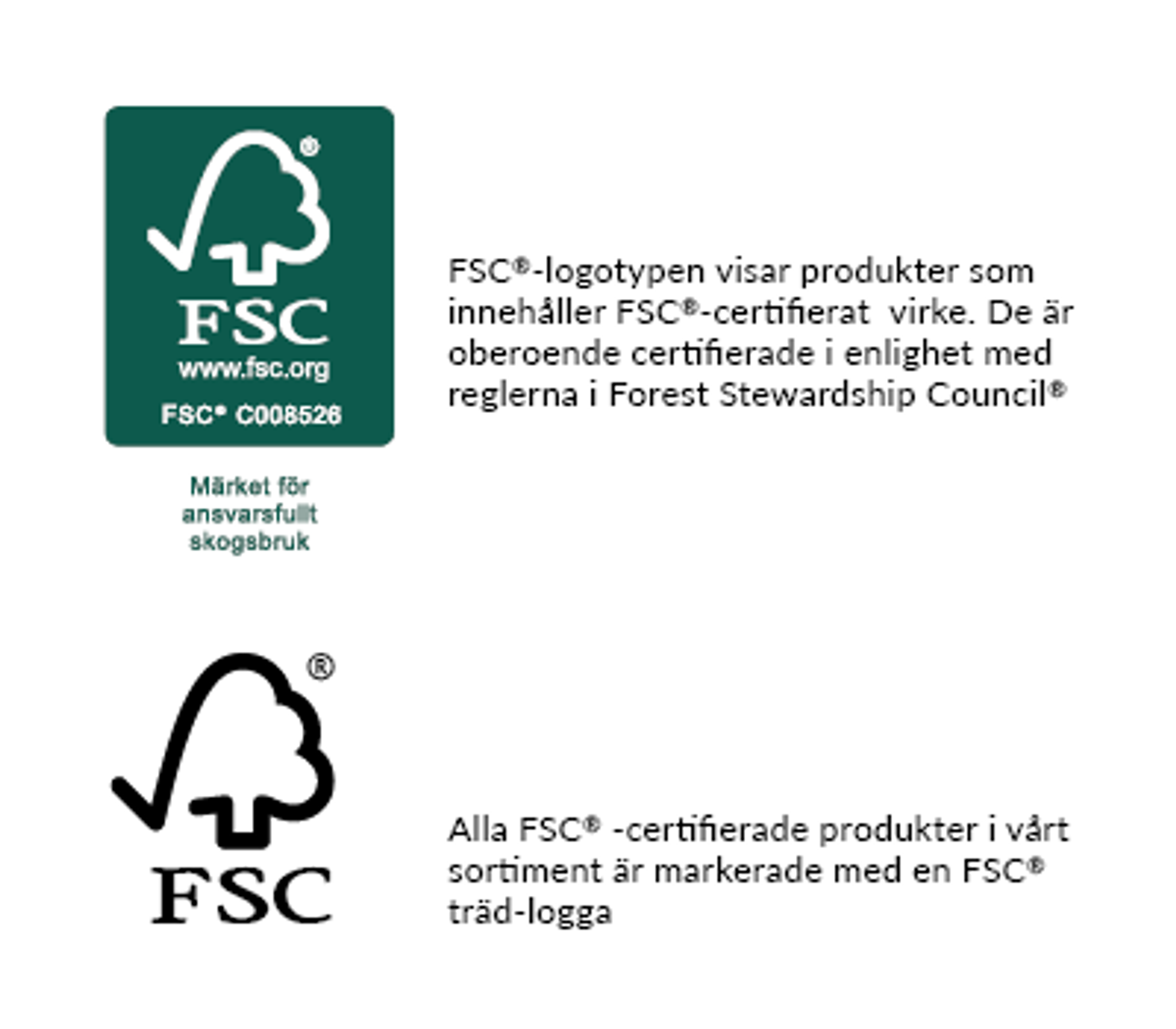 FSC®-märket signalerar att dessa produkter innehåller trä från exemplariskt skötta skogar. Dessa certifieras oberoende och i enlighet med reglerna från Forest Stewardship Council®. FSC-certifierade produkter känns igen genom FSC-trälogotypen.